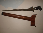 Keterangan artifak: Akuk unduk-unduk, pendokok tembaga, berpamor sarang semut. Hulu pipit teleng dan sarung kayu kemuning.