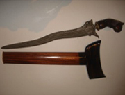 Keterangan artifak: Mata lebar berpamor (keris melela) hulu ayam teleng, sarung kayu kemunig. Sejenis senjata tempur jarak dekat