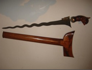 Keterangan artifak: Hulu kayu kemuning motif ayam teleng, sarung diperbuat daripada kayu kemuning, pendokok tembaga bersobek diatas. Dibahagian akut berupa seekor binatang (anjing).